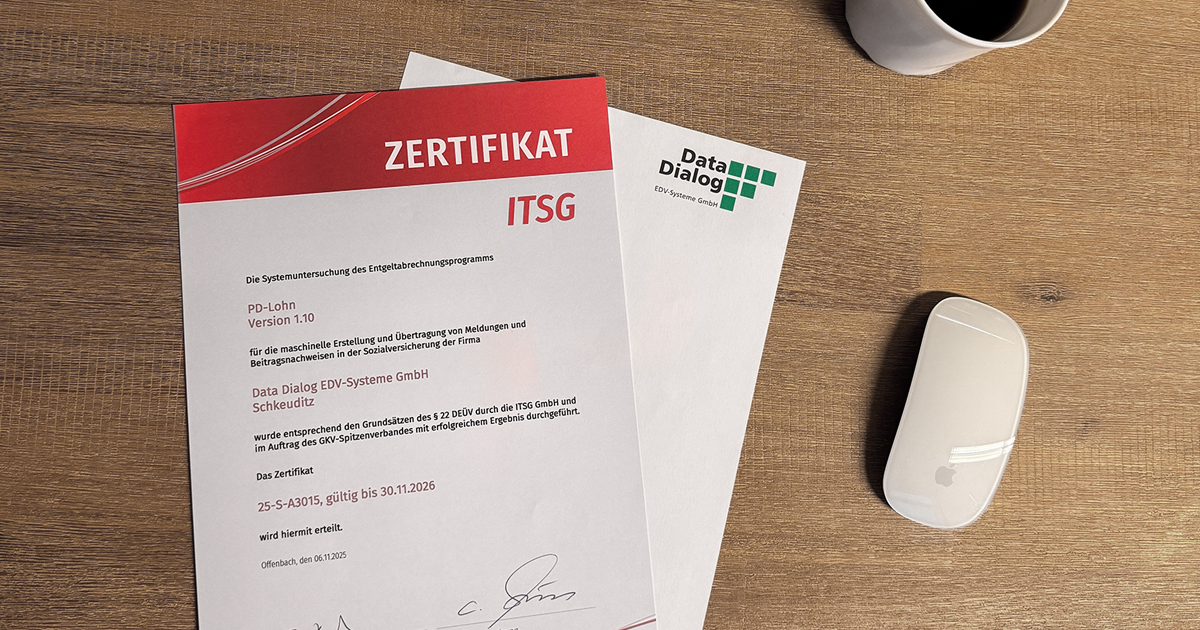 WeiterlesenWir freuen uns, dass unsere Lohnsoftware PD-Lohn auch in diesem Jahr die strenge jährliche Qualitätskontrolle der ITSG (Informationstechnische Servicestelle der Gesetzlichen Krankenversicherung) im ersten Anlauf erfolgreich bestanden hat. Die wiederh...